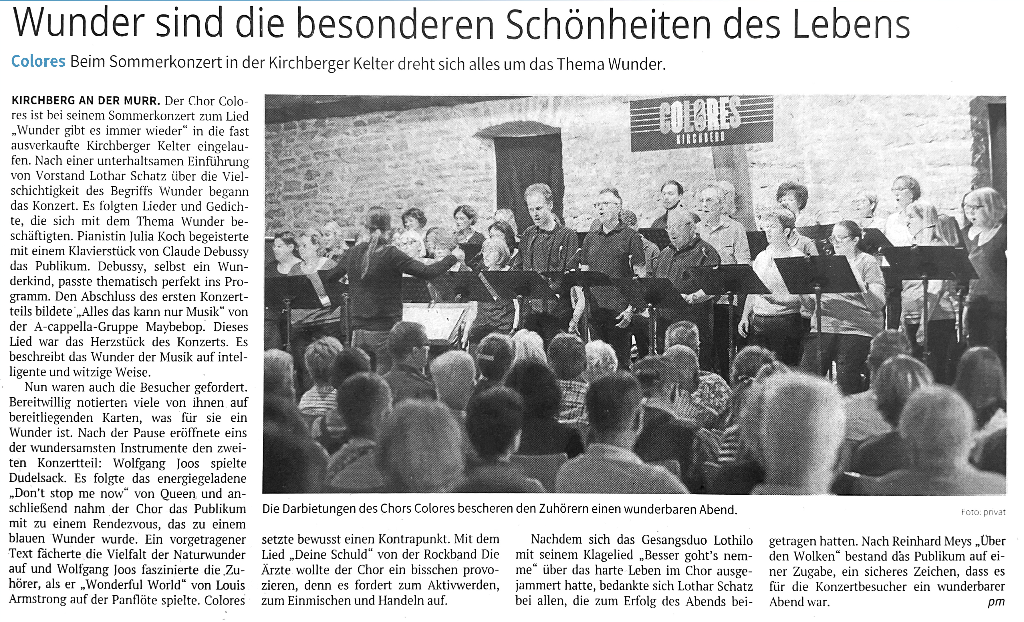 Artikel in der Marbacher Zeitung vom 17. Juli 2018 über das COLORES "Humorzert" vom 14. Juli 2018 in der Kelter